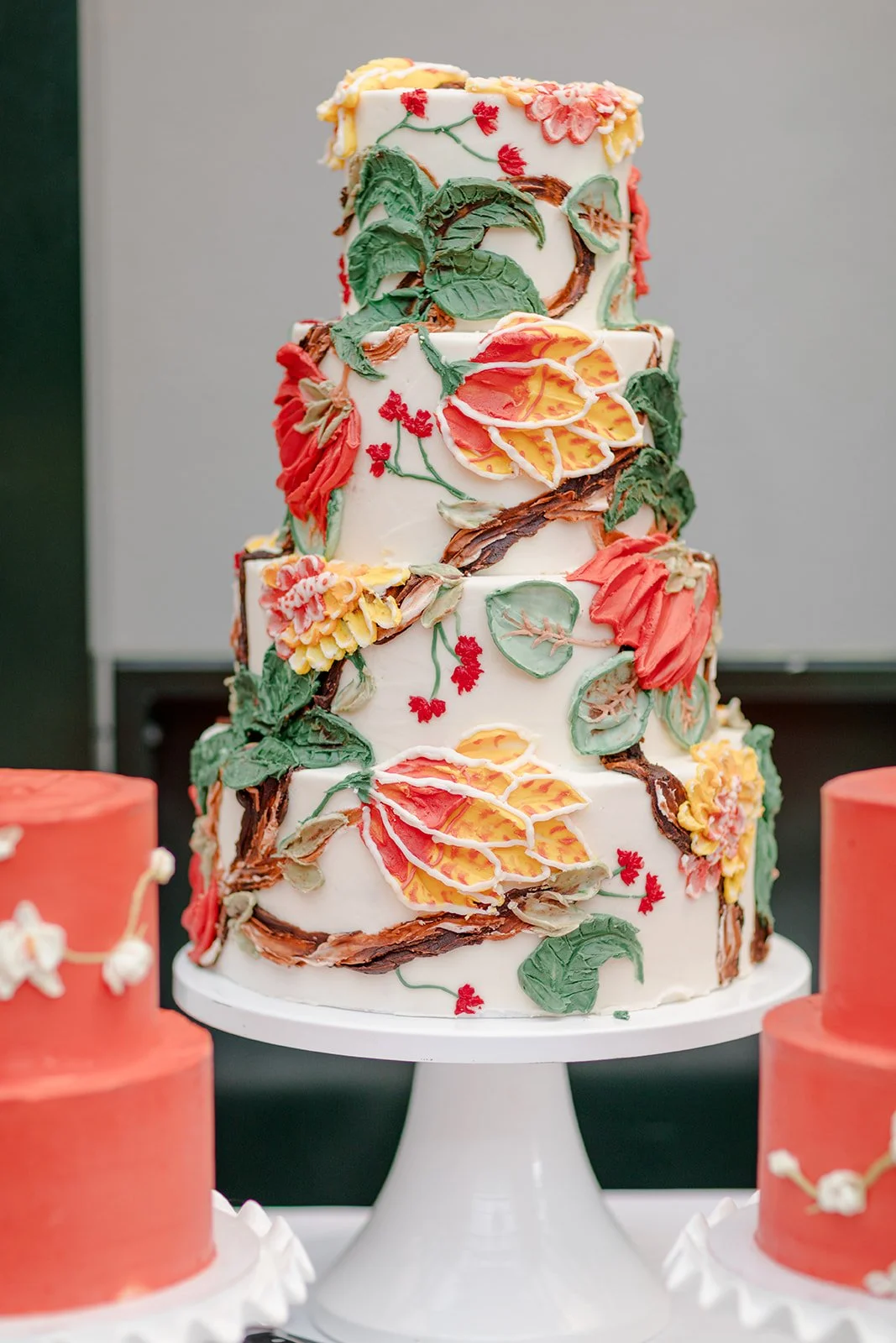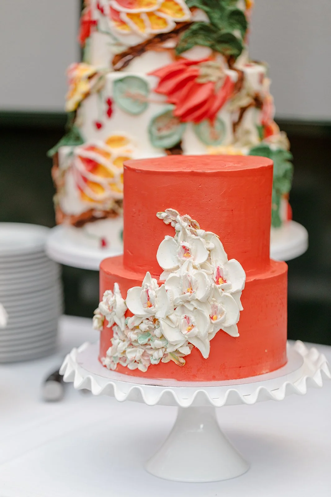 The large cake was inspired by the tablecloth! I attempted to re-envision the pattern as best I could on a round cake. The two cakes flanking it were inspired by the corals in the tablecloth with some delicate white orchids and antique hydrangeas.